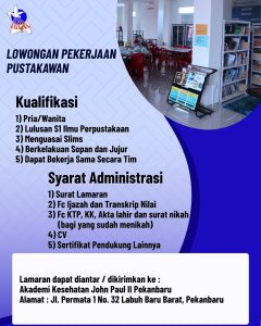 Akademi Kesehatan John Paul II Pekanbaru membuka kesempatan bagi putra-putri terbaik untuk bergabung sebagai Pustakawan. Kami mencari individu yang profesional, berintegritas, dan memiliki kompetensi di bidang ilmu perpustakaan untuk mendukung