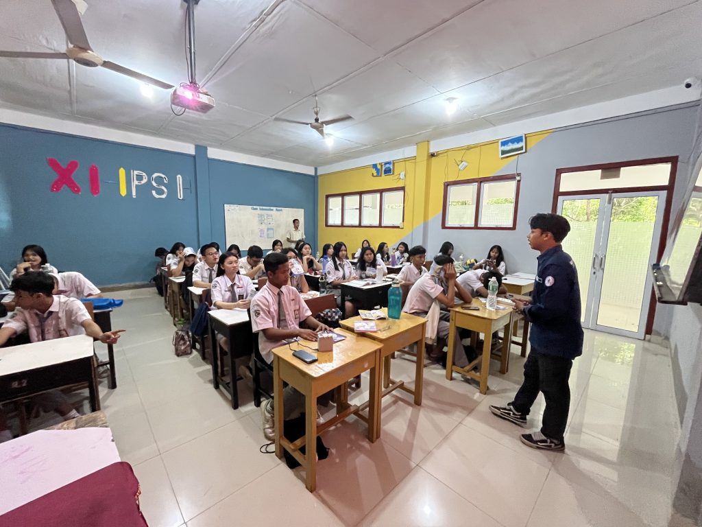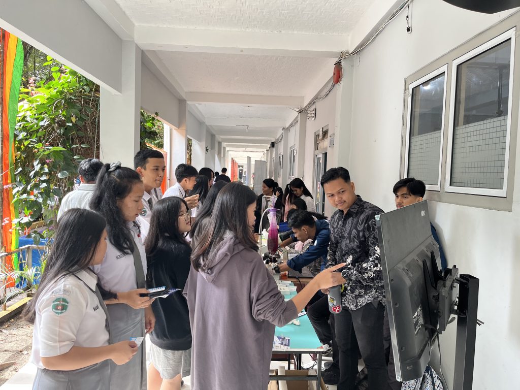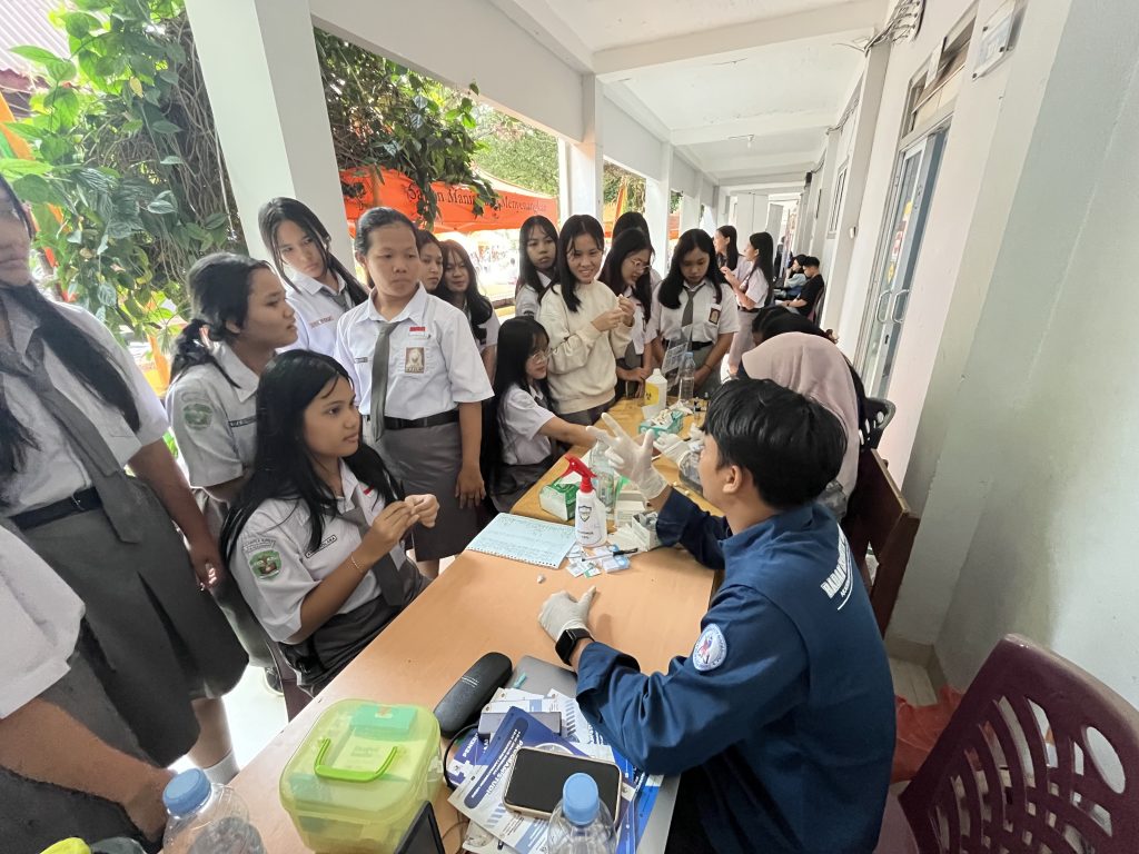 Tidak hanya presentasi, di halaman sekolah juga dibuka stand khusus yang menghadirkan beragam aktivitas menarik. Para siswa dapat melakukan tes golongan darah secara langsung, sekaligus belajar dari dekat menggunakan beberapa alat peraga praktikum yang dibawa, seperti phantom untuk simulasi pengambilan darah. Kehadiran alat ini menjadi daya tarik tersendiri karena siswa bisa melihat secara nyata bagaimana proses pembelajaran praktis di dunia kesehatan.